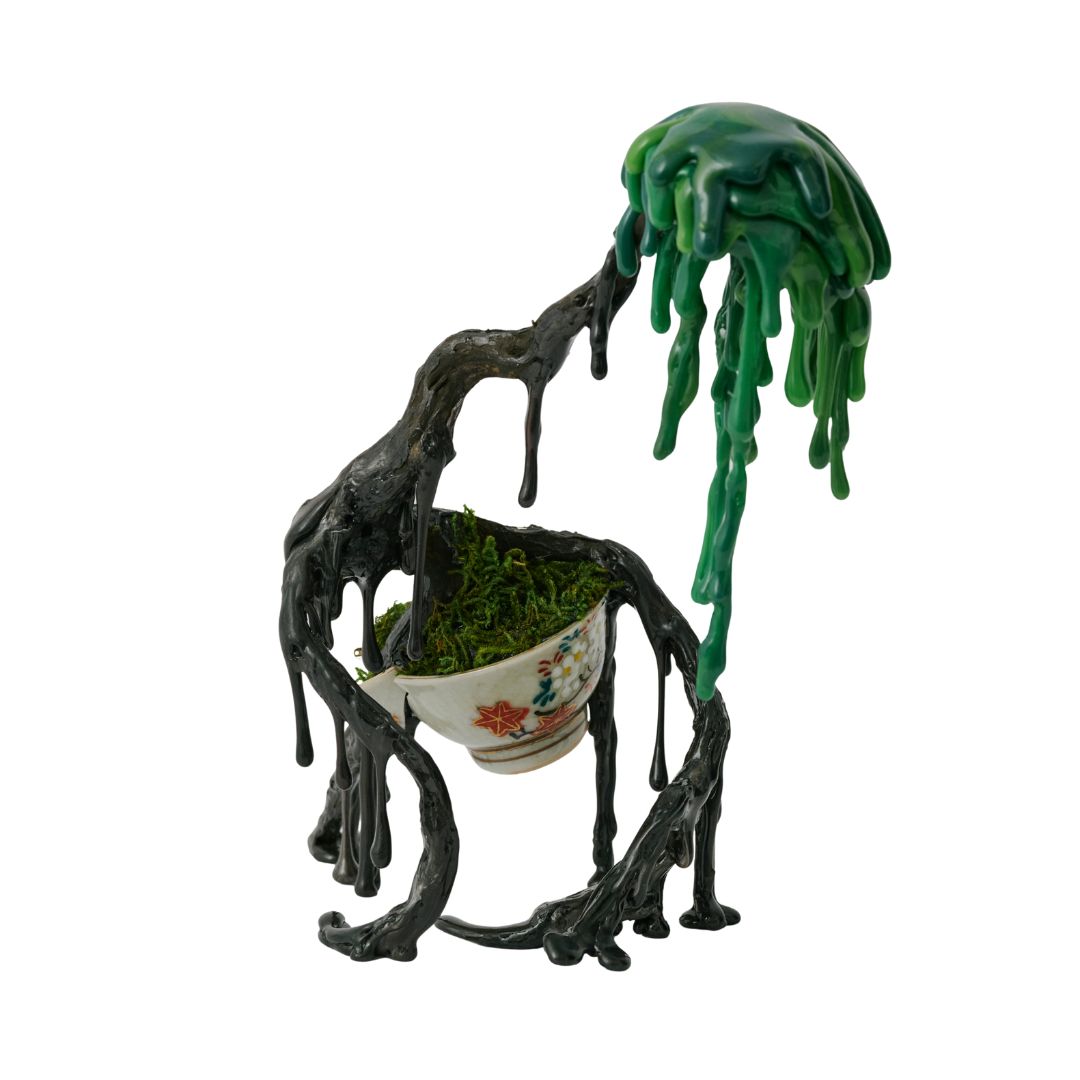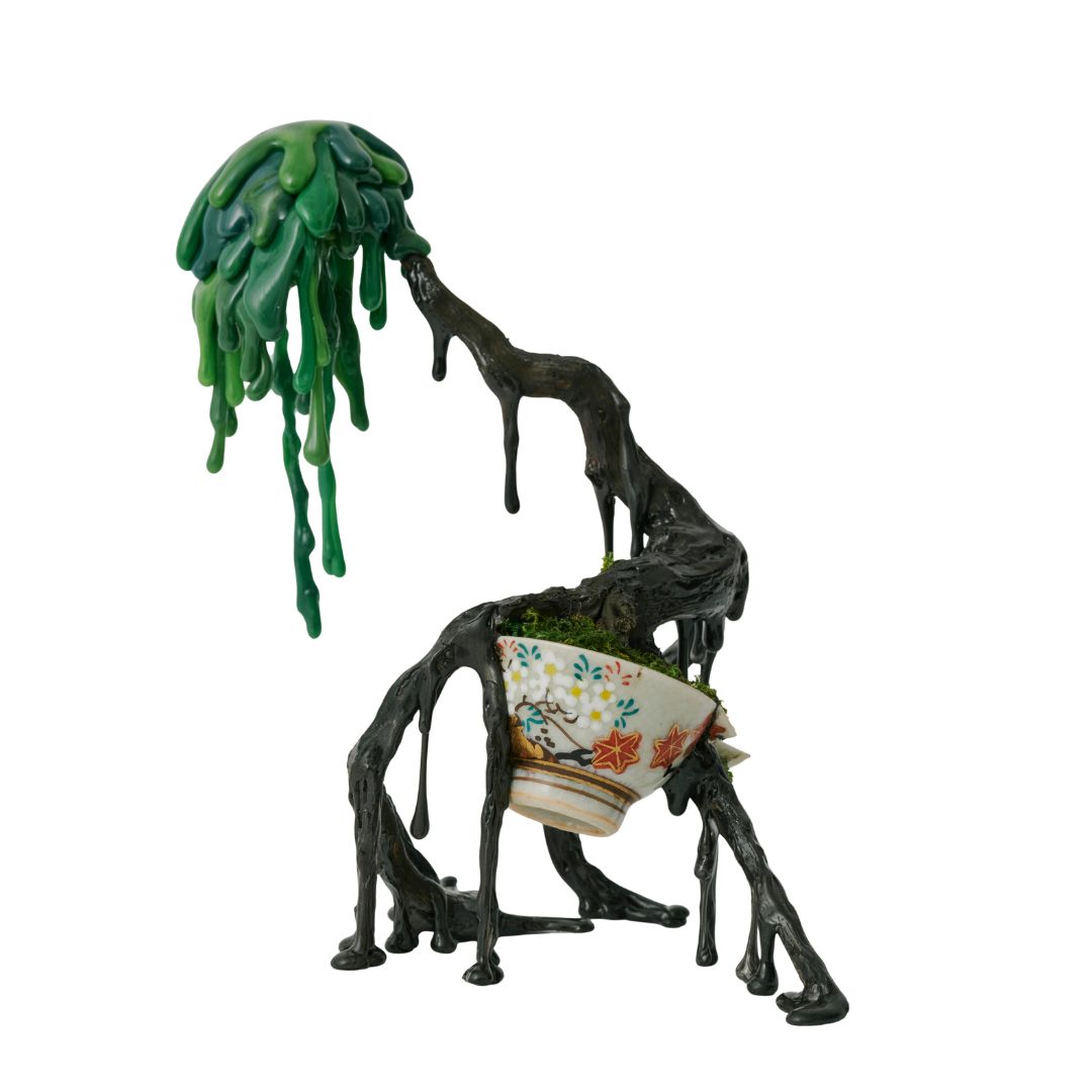 Chiho Monguchi氏の融景シリーズ『器穿立』。器の中で育った樹は、いつしか器を突き破り、自らの脚で立ち上がる。
