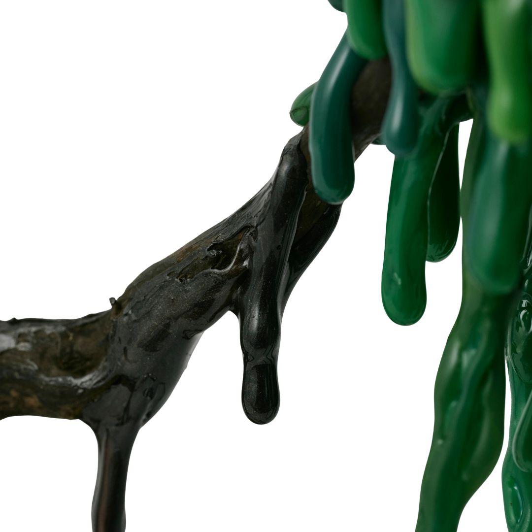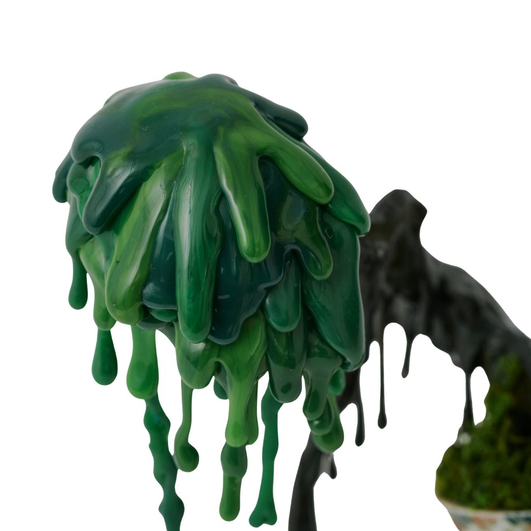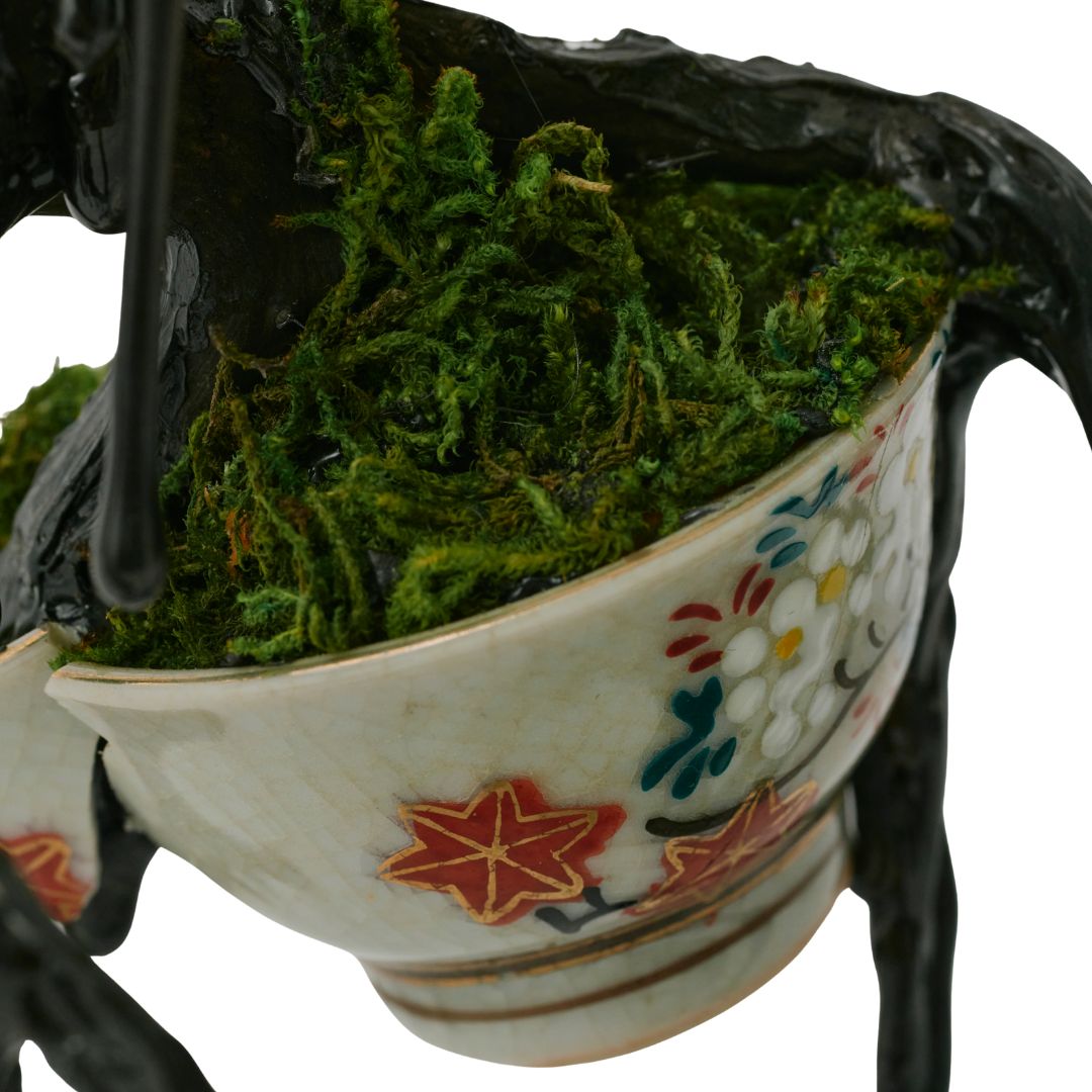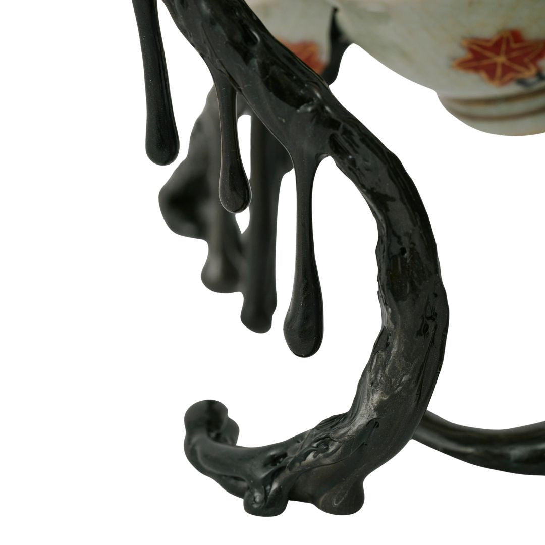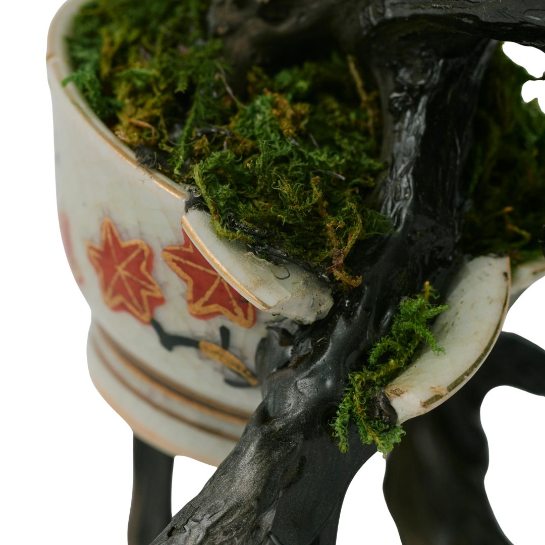 繊細に作られた磁器を支えるのは、滴るように黒く光る根の構造。その一本一本に、重ねてきた時間と、未来へ向かう強さが宿る。