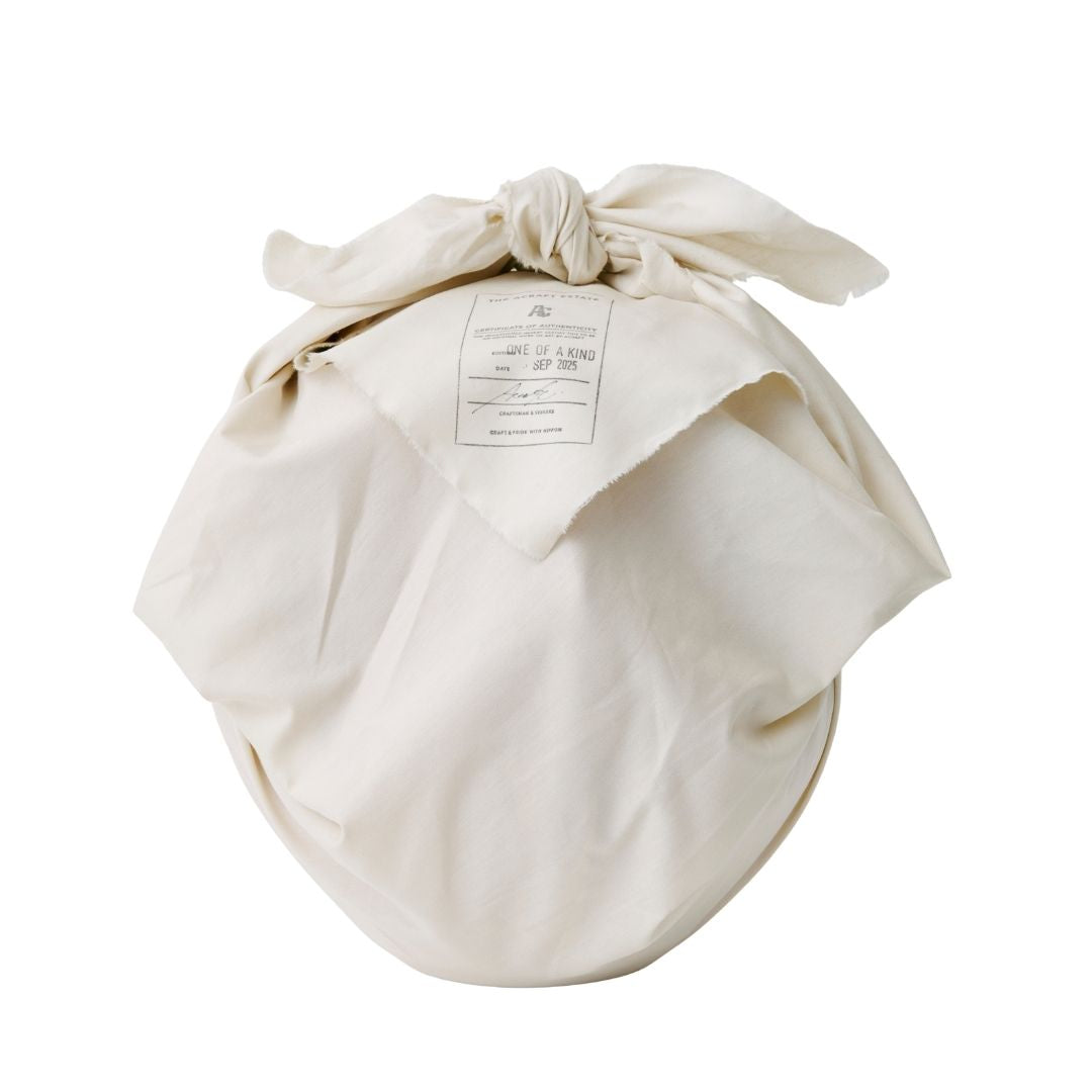 The face, wrapped in the same fabric, brings harmony and warmth to the whole form.
