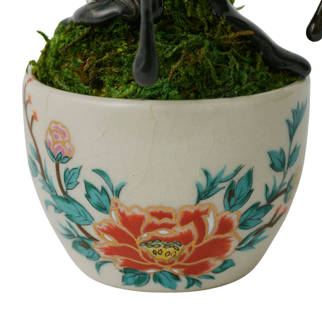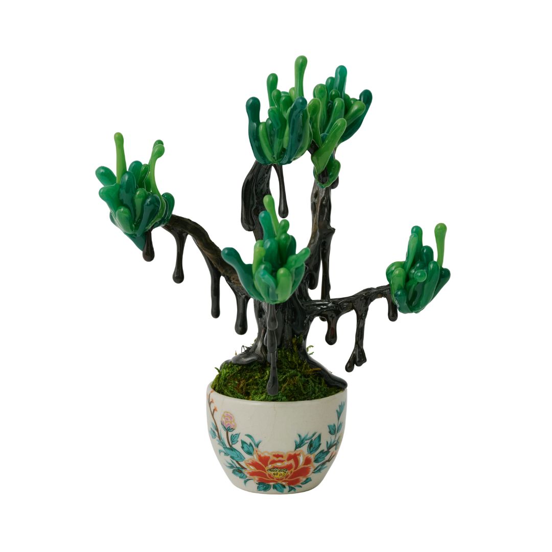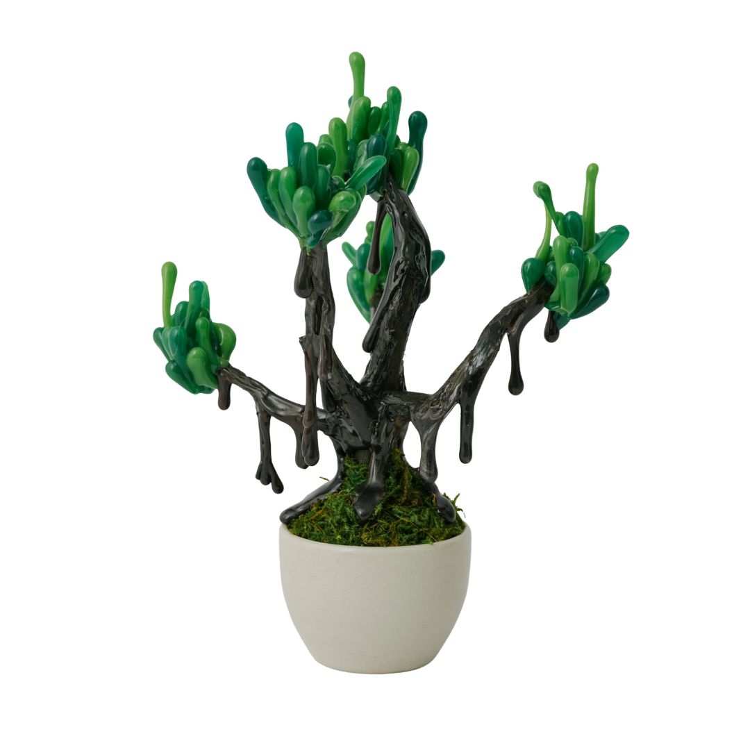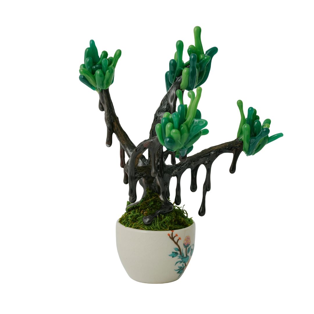 Chiho Monguchi氏の融景シリーズ『萌昇樹』。器の中から芽吹いた命が、空へ向かって昇っていく。伝統の器を土台に、未来を目指して成長する力強さを、枝先に託した。重力に逆らうように立ち上がる若芽が、希望のかたちを描き出し、変化と継承、そのどちらも肯定するように佇んでいる。
