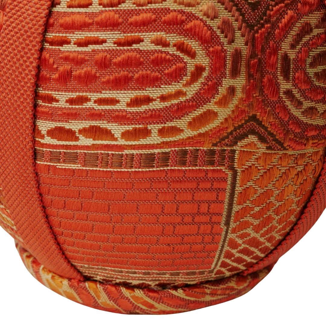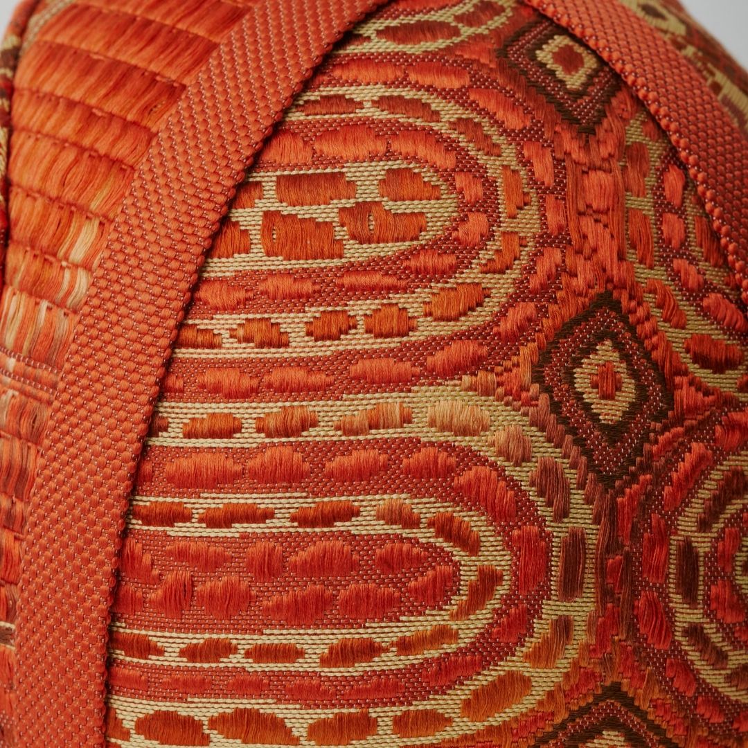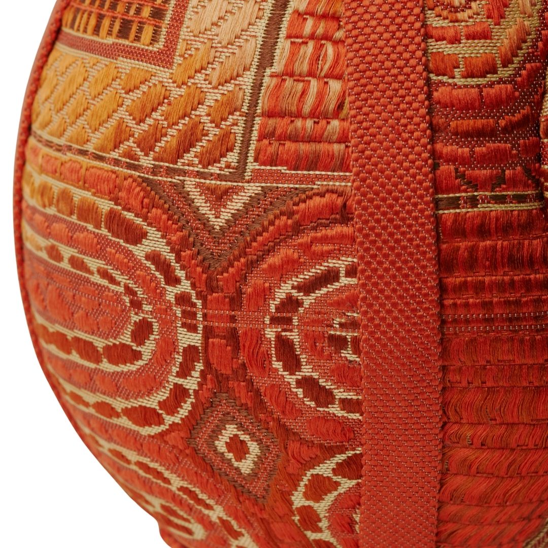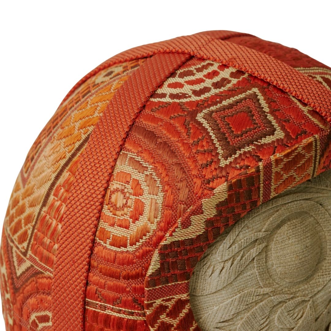 円環や放射状の文様が、達磨の丸みと呼応しながら柔らかく広がる。