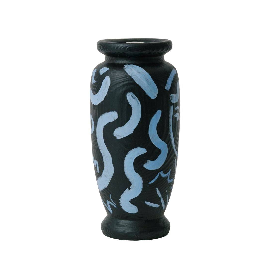 From the black-dominated canvas, soft shades of blue emerge, as if seeping through.