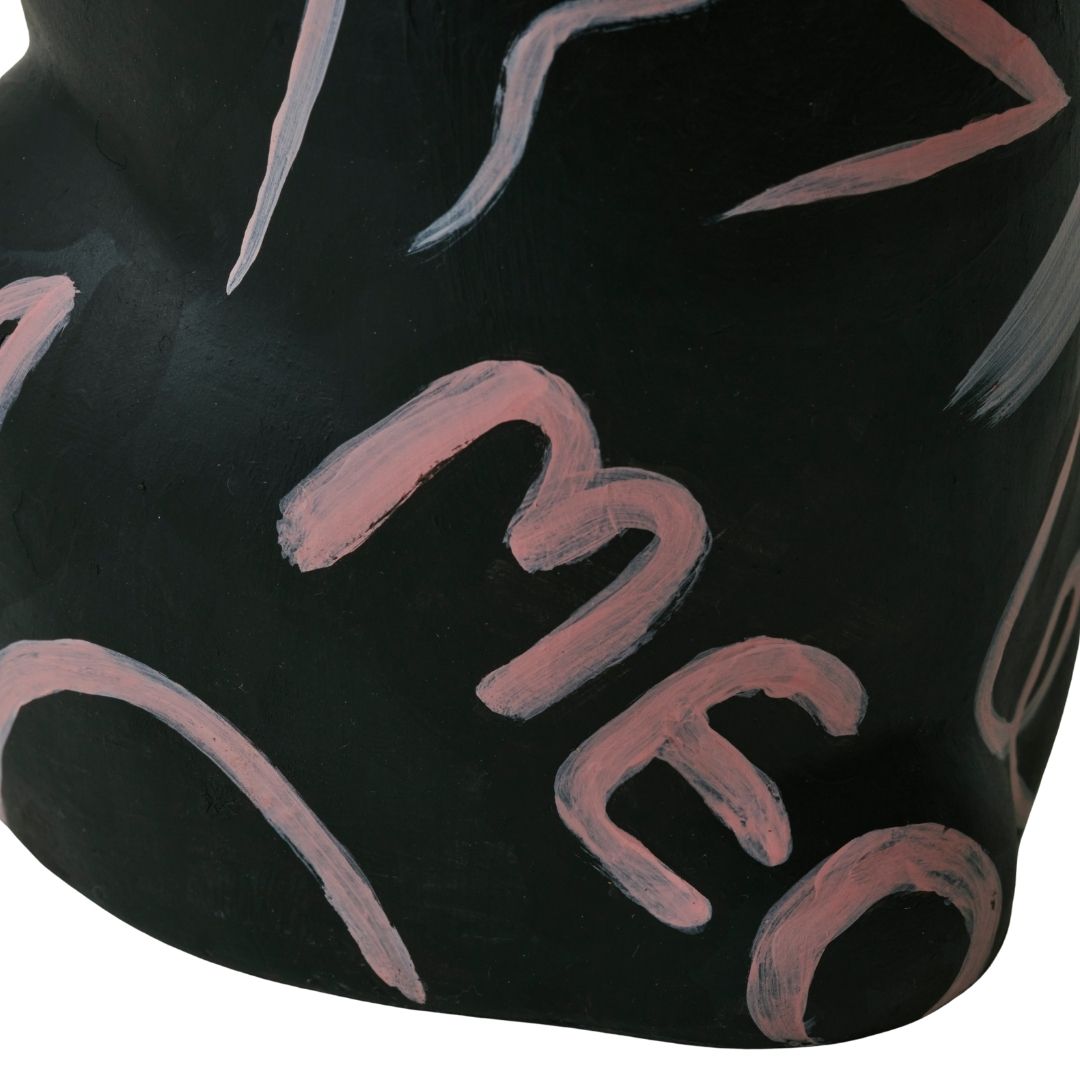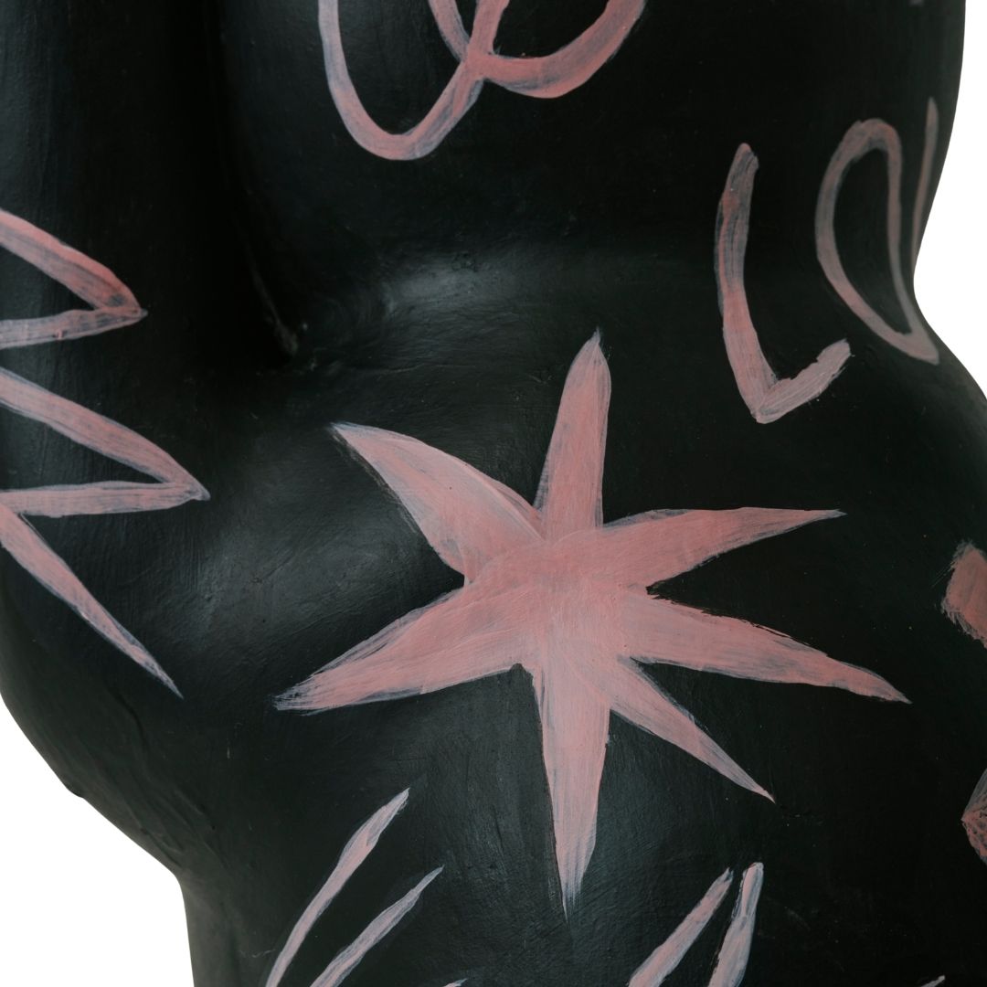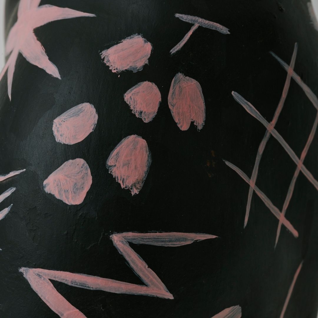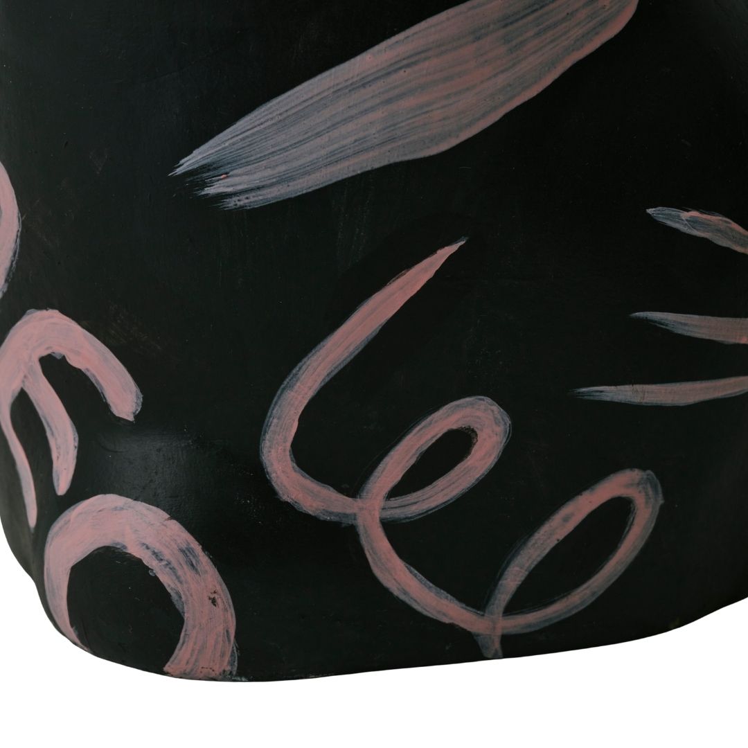 黒を基調にしたボディに、淡くやわらかな色で浮かび上がるモチーフが、静かな力強さを宿す。