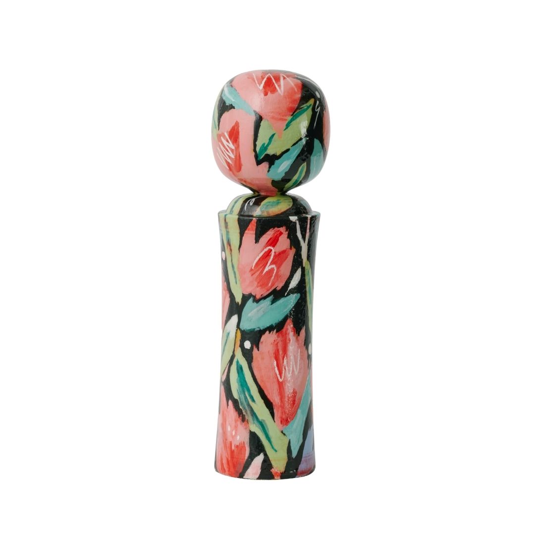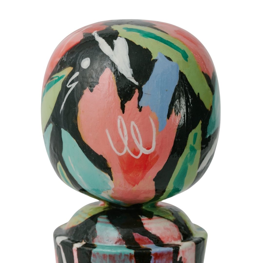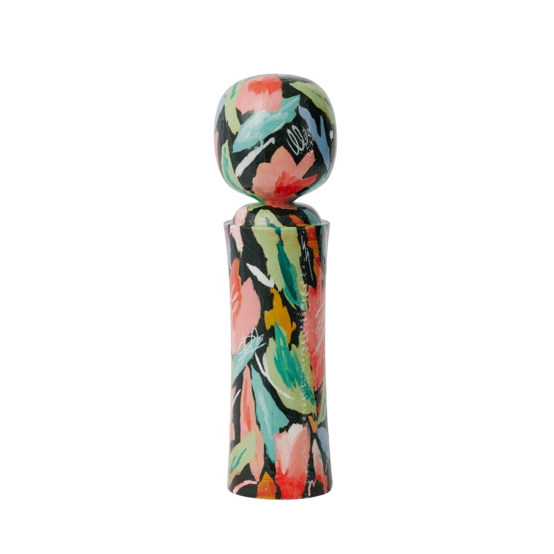 ODA Yuji氏の『Night Cruising』。夜の静けさのなか、草花がざわめきながら踊る。混じり合う絵具の色や、のびやかな形が生き物のようにこけしの表面をめぐっている。色彩も構成もリズミカルで、軽やかだけど芯がある。感覚的に描かれているようで、計算された構成力を感じさせる。一見抽象に見えて、どこか情景が立ち上がるような不思議な魅力がある。